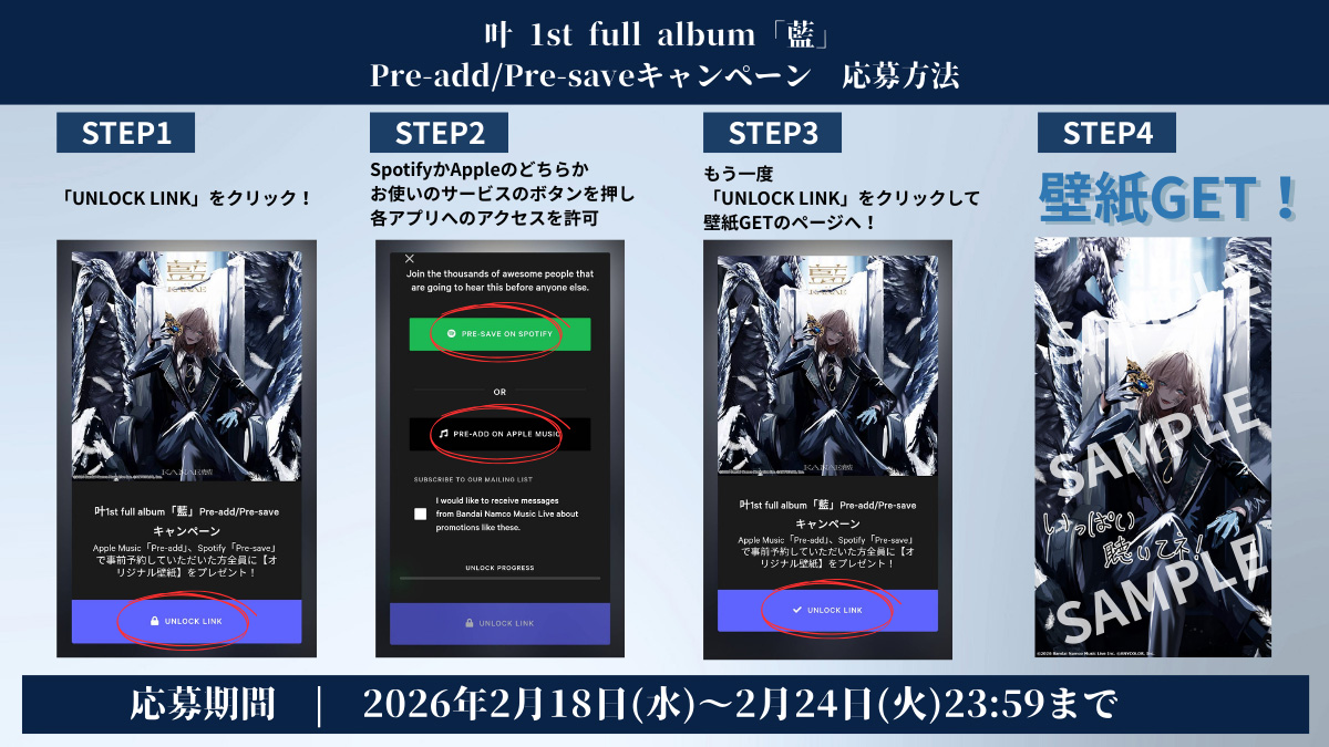 叶1st full album『藍』リリースを記念して、期間内にApple MusicもしくはSpotifyにて事前予約をしていただいた方全員に、【叶『藍』オリジナル壁紙】をプレゼント!